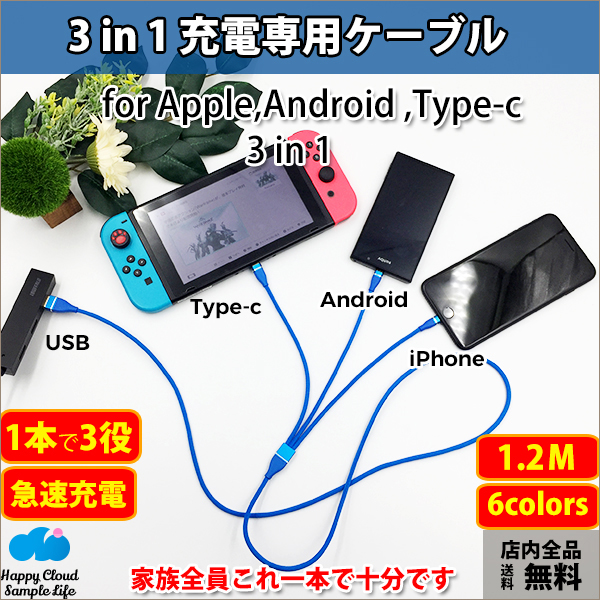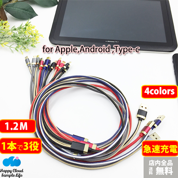 3in1 iPhoneケーブル androidケーブル type-cケーブル 充電ケーブル 充電器 コード 1.2m 急速充電 断線防止 iPhoneX iPhone8 iPhone7 iPad コネクタ ナイロン