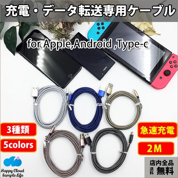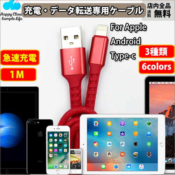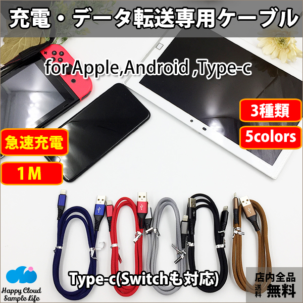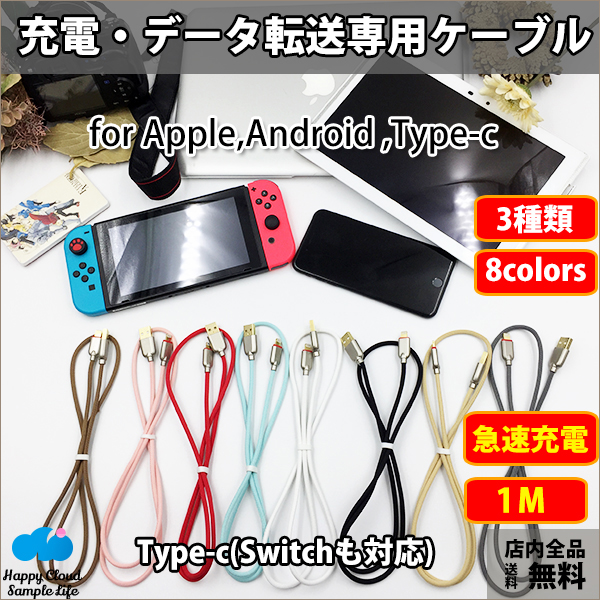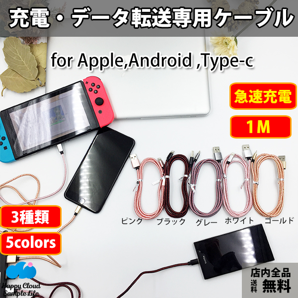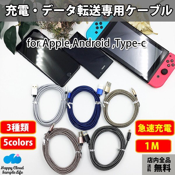 カラフル Switch Type-c Android iPhone充電ケーブル 全8色 ポイント消化 Lightningケーブル ライトニングケーブル 1m 高耐久 ナイロン編み 高速充電 アイフォン